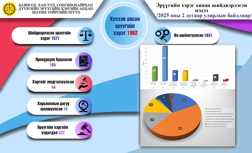 - 2025 оны 6 дугаар сарын 20-ны өдрийн байдлаар буюу 2 дугаар улирлын эрүүгийн хэрэг хянан шийдвэрлэх ажиллагааны товч мэдээллийг танилцуулж байна.