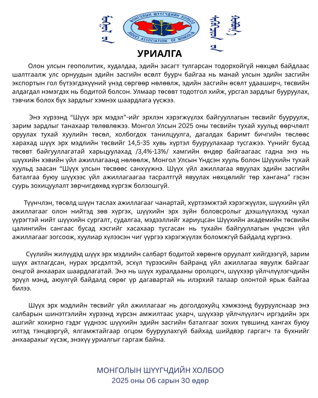 Монголын шүүгчдийн холбоо "Уриалга"
