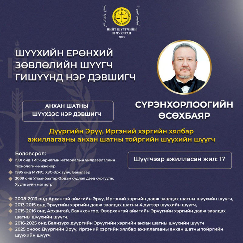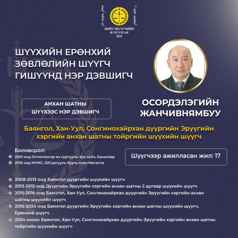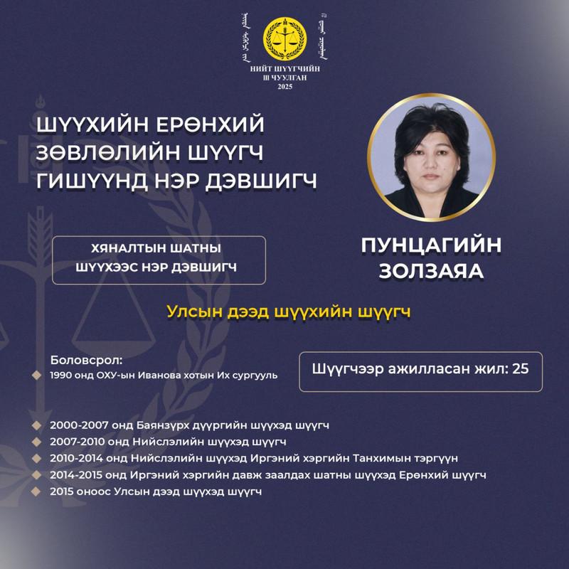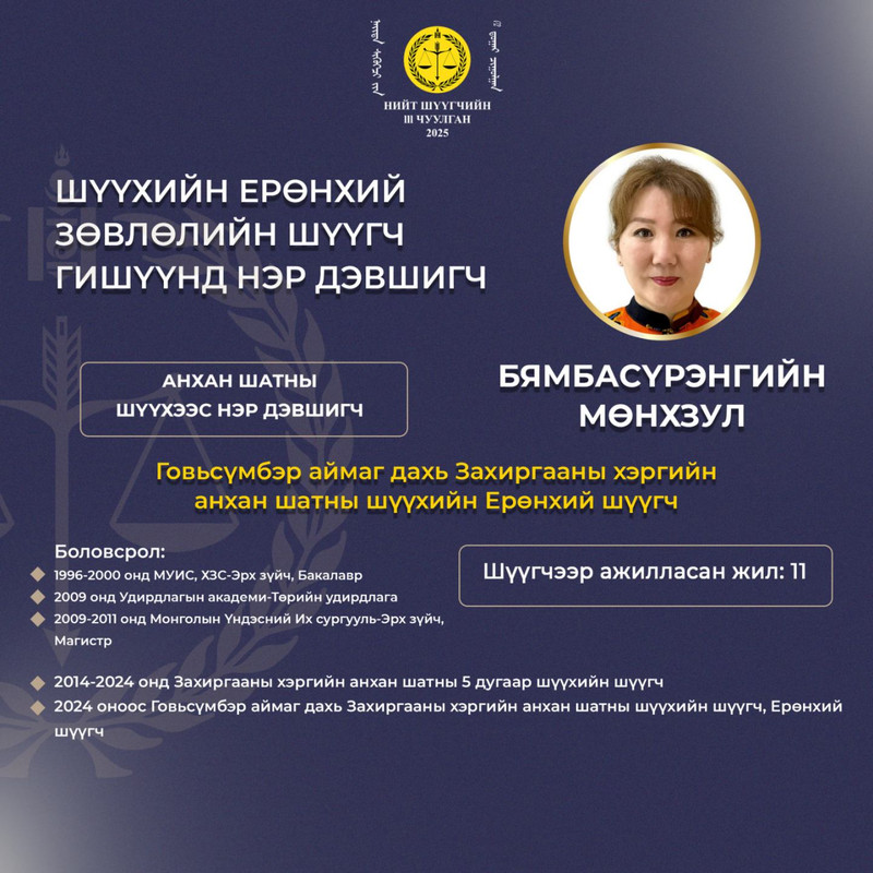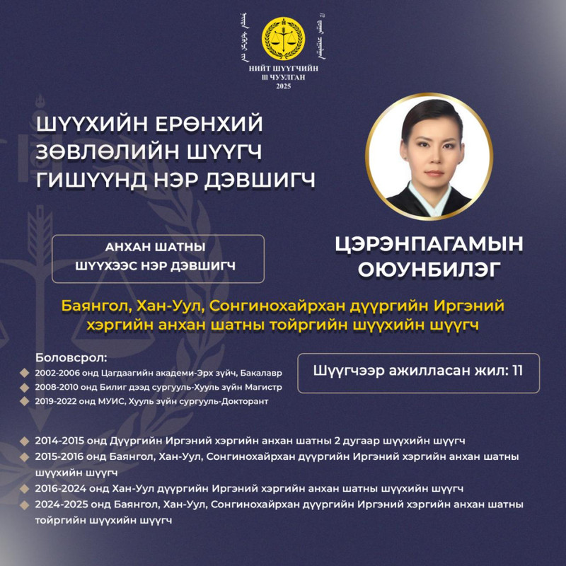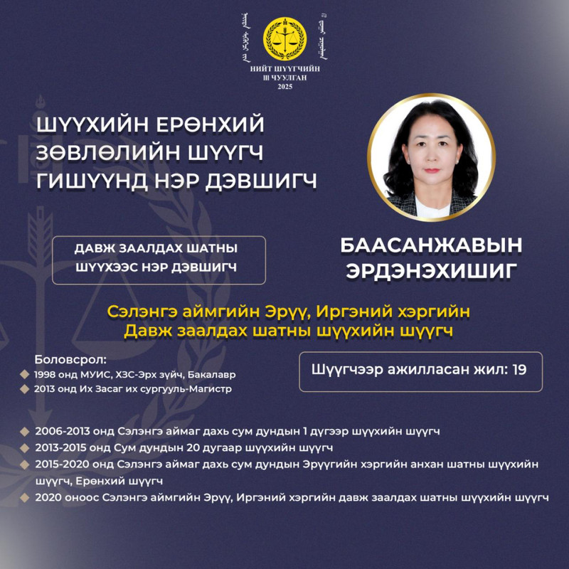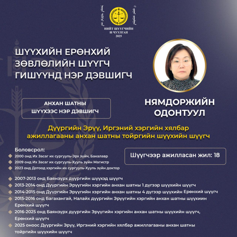 Шүүхийн ерөнхий зөвлөлийн шүүгч гишүүнд 15 шүүгч нэрээ дэвшүүлж, Нийт шүүгчийн III чуулганыг зохион байгуулах ажлын хэсэгт материалаа ирүүлсэн. Нэр дэвшигчдийн ирүүлсэн танилцуулга мэдээллийг хүргэж байна.