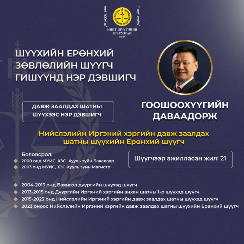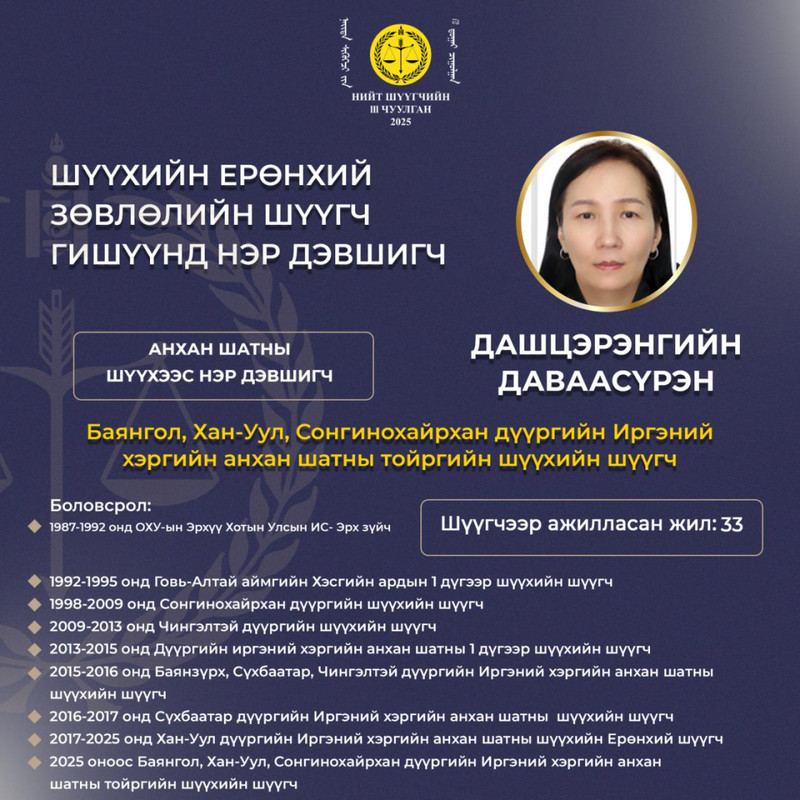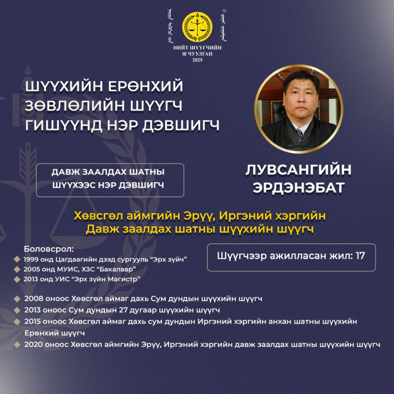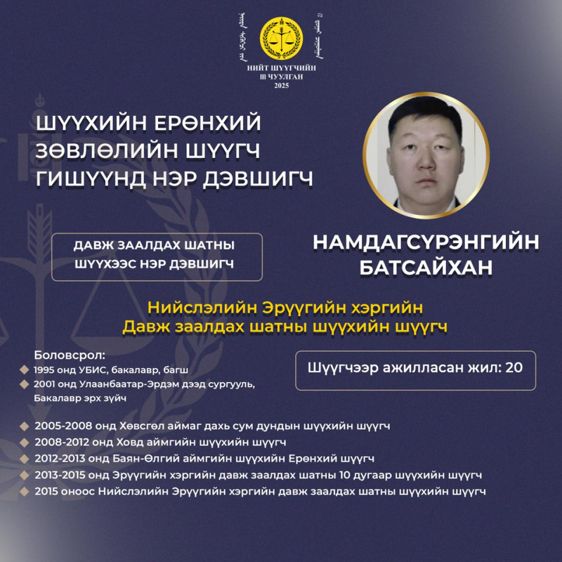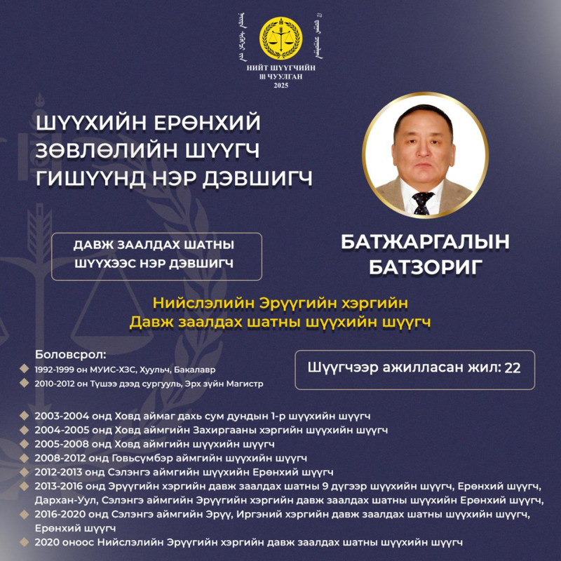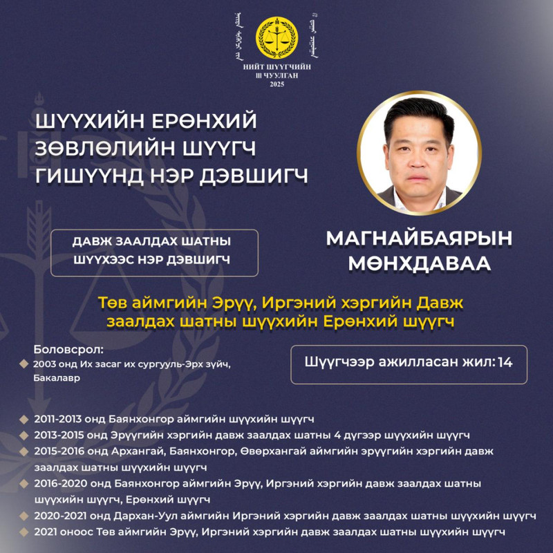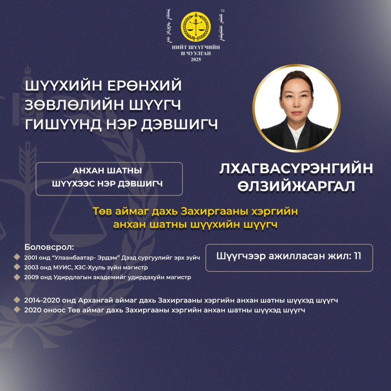 Шүүхийн ерөнхий зөвлөлийн шүүгч гишүүнд 15 шүүгч нэрээ дэвшүүлж, Нийт шүүгчийн III чуулганыг зохион байгуулах ажлын хэсэгт материалаа ирүүлсэн. Нэр дэвшигчдийн ирүүлсэн танилцуулга мэдээллийг хүргэж байна.