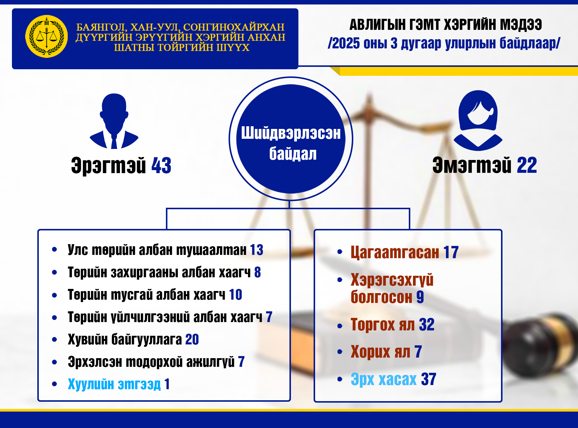 - Тус шүүхээр шийдвэрлэсэн "АВЛИГЫН ГЭМТ ХЭРГИЙН МЭДЭЭ"-г 2025 оны 3 дугаар улирлын байдлаар буюу /2024.12.21-2025.09.19/ өдрөөр тасалбар болгон танилцуулж байна.
