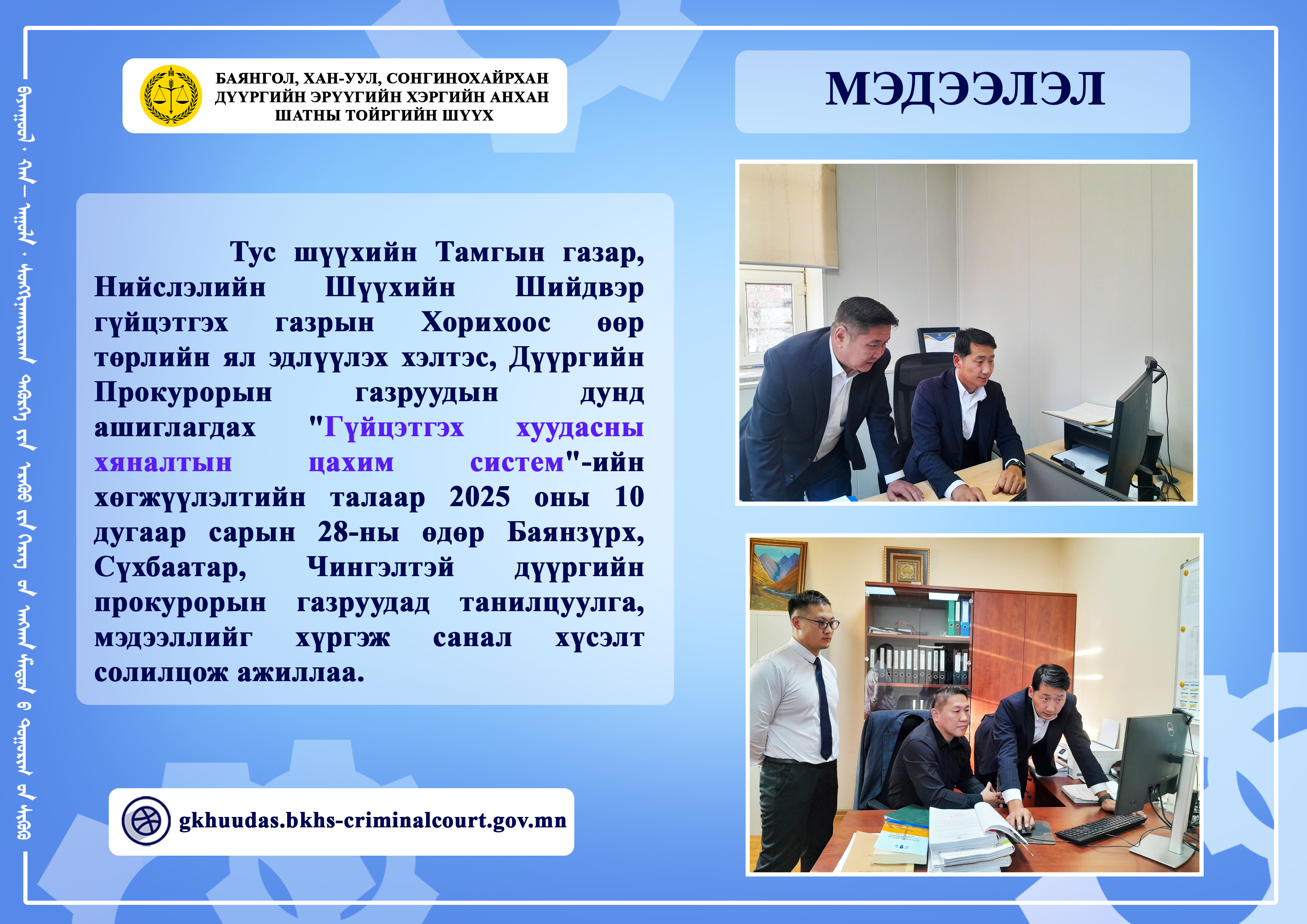 БАЯНГОЛ, ХАН-УУЛ, СОНГИНОХАЙРХАН ДҮҮРГИЙН ЭРҮҮГИЙН ХЭРГИЙН АНХАН ШАТНЫ ТОЙРГИЙН ШҮҮХ ТОЙМ /2025.10.20-2025.10.21/
