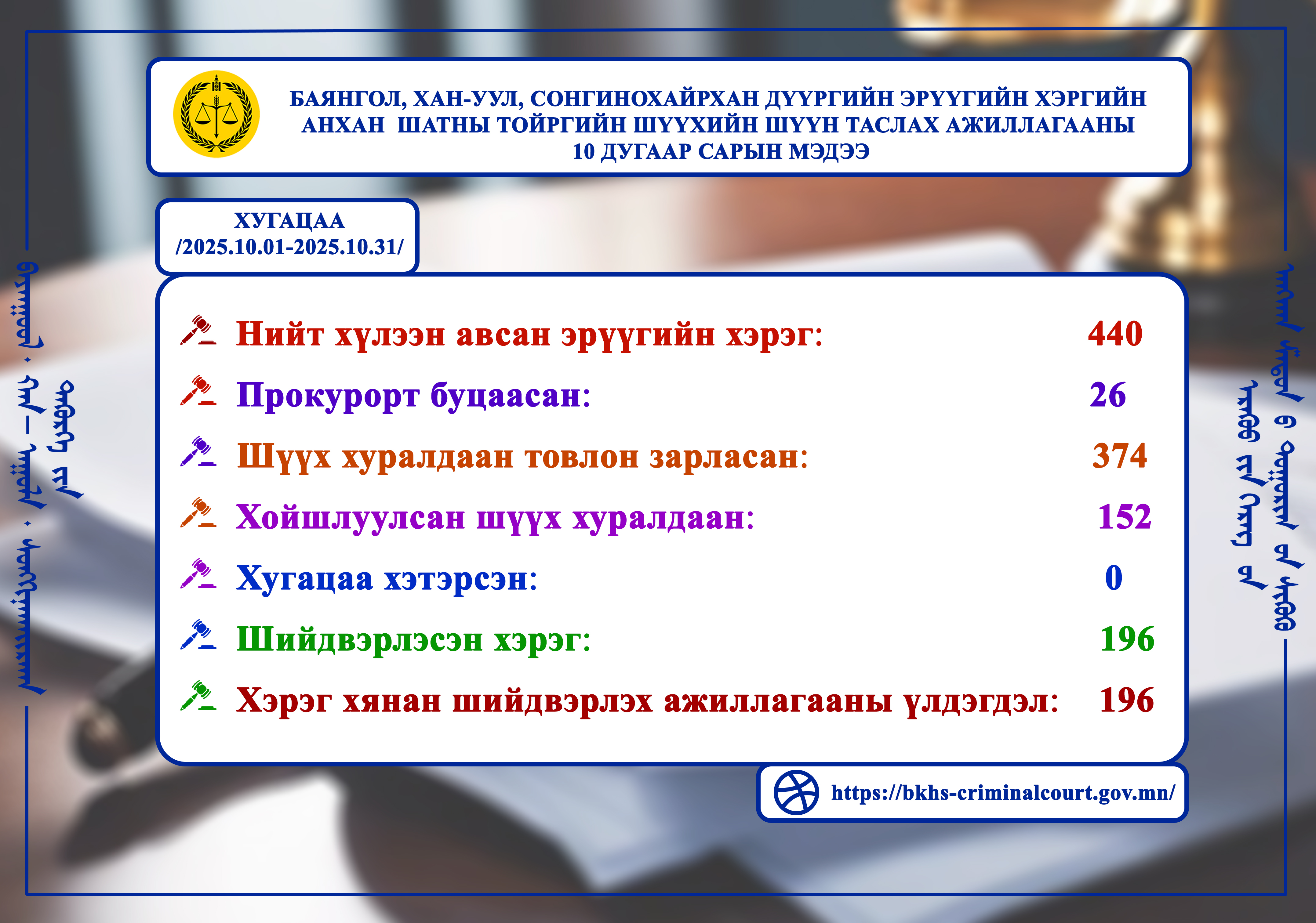 ШҮҮН ТАСЛАХ АЖИЛЛАГААНЫ МЭДЭЭ 2025 оны 10 дугаар сарын шүүн таслах ажиллагааны мэдээг танилцуулж байна.
