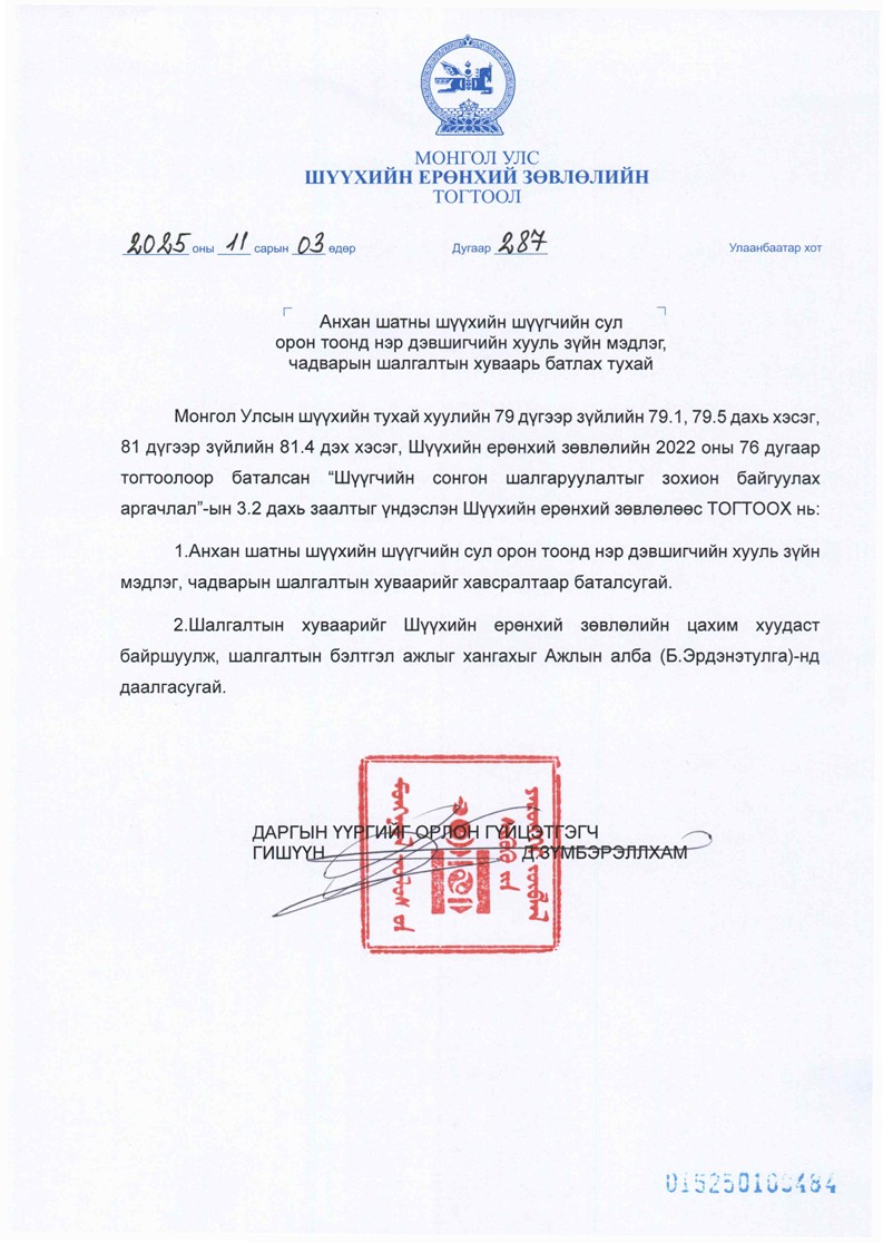 АНХАН ШАТНЫ ШҮҮХИЙН ШҮҮГЧИЙН СОНГОН ШАЛГАРУУЛАЛТЫН ШАЛГАЛТЫН ХУВААРЬ БАТЛАГДЛАА Шүүхийн ерөнхий зөвлөлийн 2025 оны 11 дүгээр сарын 3-ны өдрийн 285 дугаар тогтоолоор анхан шатны шүүхийн шүүгчийн 37 сул орон тоонд нэр дэвшигчдийг бүртгэв. Нэр дэвшигчид хууль зүйн мэдлэг, чадварыг үнэлэх шалгалтад батлагдсан хуваарийн дагуу оролцох бөгөөд шалгалтын дэлгэрэнгүй хуваарийг танилцуулж байна.