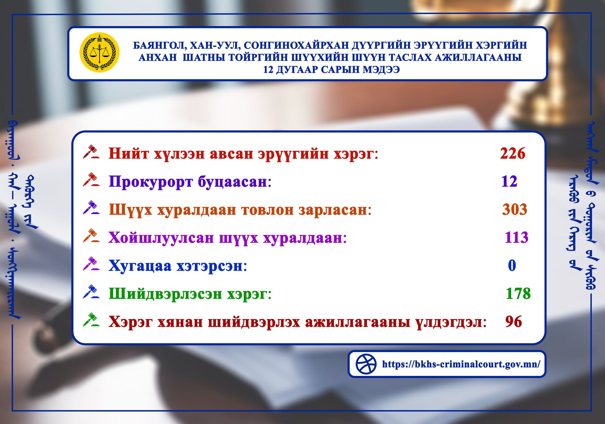 ШҮҮН ТАСЛАХ АЖИЛЛАГААНЫ МЭДЭЭ 2025 оны 12 дугаар сарын шүүн таслах ажиллагааны мэдээг танилцуулж байна.