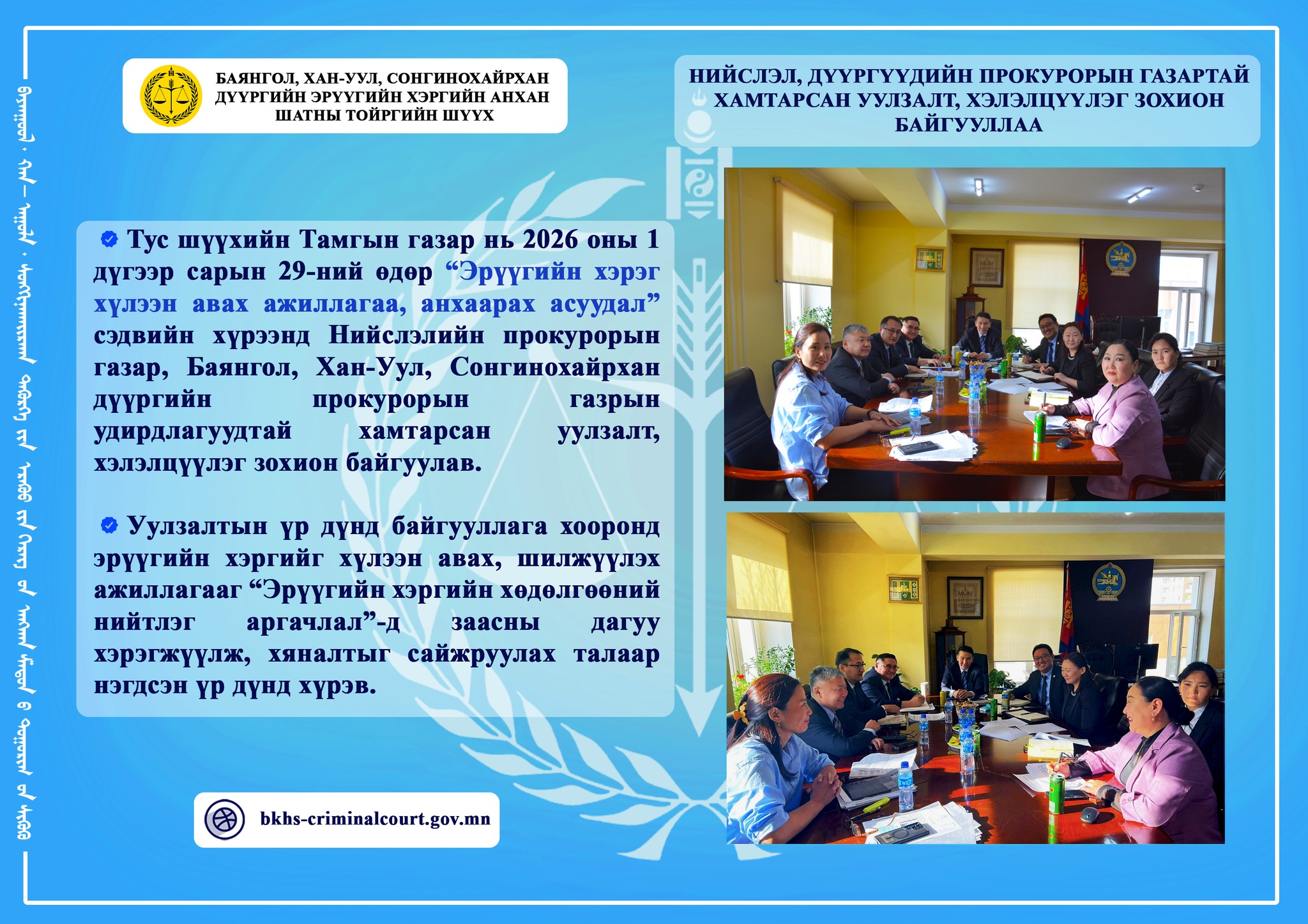 НИЙСЛЭЛ, ДҮҮРГҮҮДИЙН ПРОКУРОРЫН ГАЗАРТАЙ ХАМТАРСАН УУЛЗАЛТ, ХЭЛЭЛЦҮҮЛЭГ ЗОХИОН БАЙГУУЛЛАА