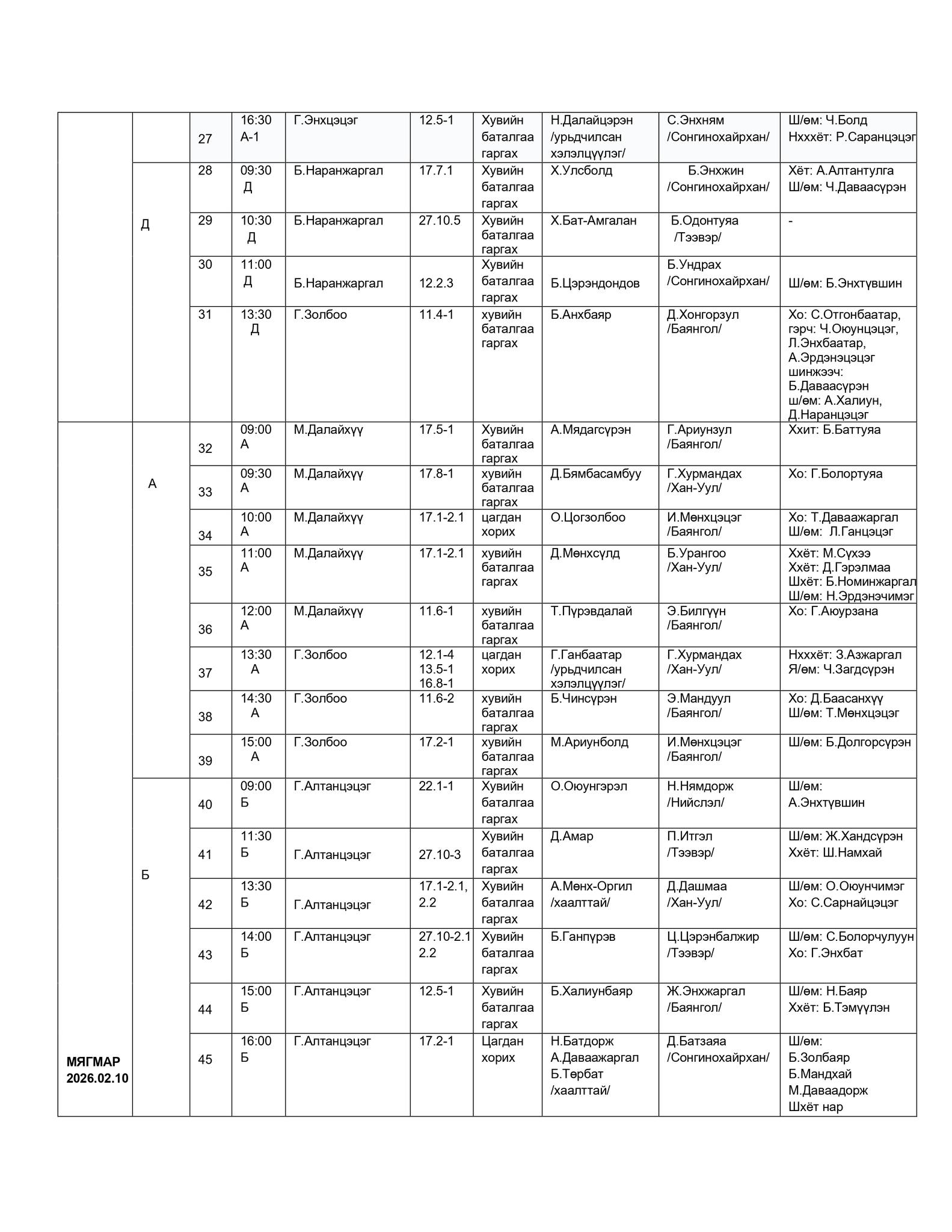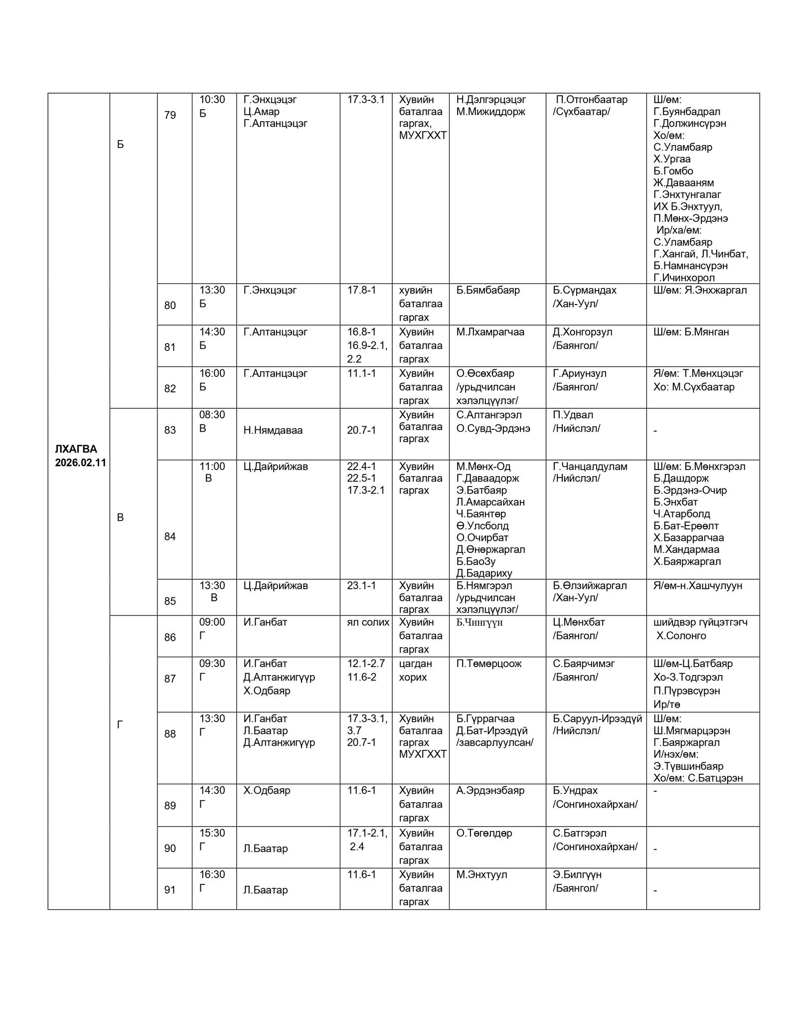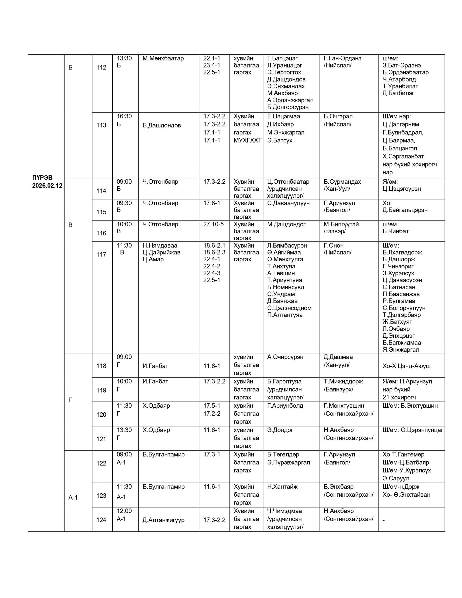 - БАЯНГОЛ, ХАН-УУЛ, СОНГИНОХАЙРХАН ДҮҮРГИЙН ЭРҮҮГИЙН ХЭРГИЙН АНХАН ШАТНЫ ТОЙРГИЙН ШҮҮХИЙН ШҮҮХ ХУРАЛДААНЫ ЗАР /2026.02.09-2025.02.13/