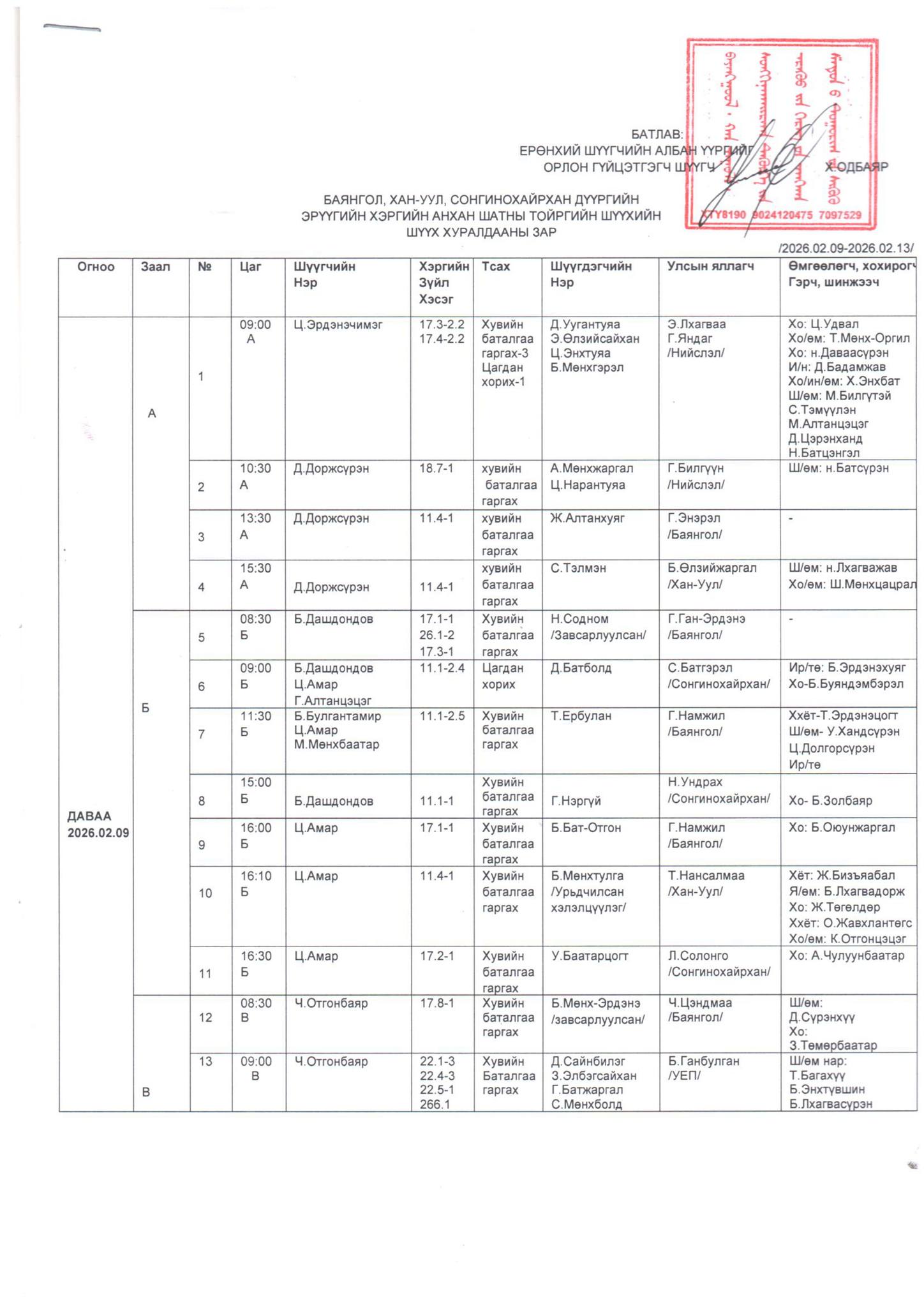 БАЯНГОЛ, ХАН-УУЛ, СОНГИНОХАЙРХАН ДҮҮРГИЙН ЭРҮҮГИЙН ХЭРГИЙН АНХАН ШАТНЫ ТОЙРГИЙН ШҮҮХИЙН ШҮҮХ ХУРАЛДААНЫ ЗАР /2026.02.09-2025.02.13/