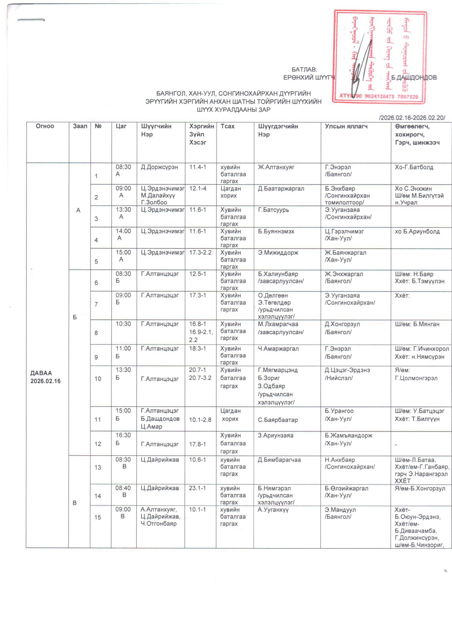 БАЯНГОЛ, ХАН-УУЛ, СОНГИНОХАЙРХАН ДҮҮРГИЙН ЭРҮҮГИЙН ХЭРГИЙН АНХАН ШАТНЫ ТОЙРГИЙН ШҮҮХИЙН ШҮҮХ ХУРАЛДААНЫ ЗАР /2026.02.16-2025.02.20/