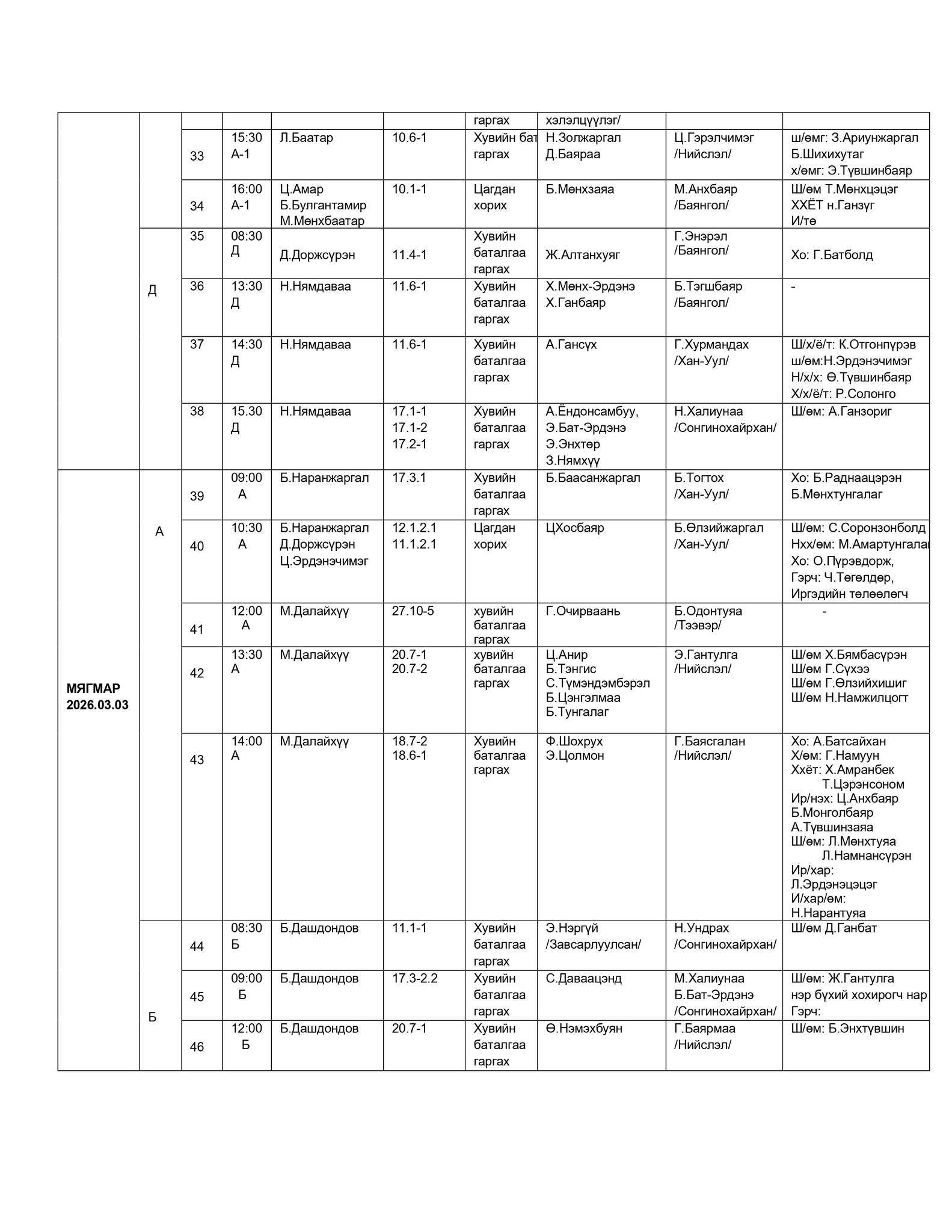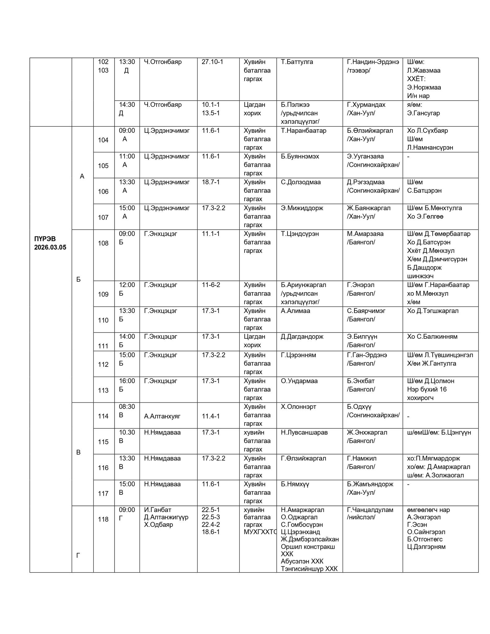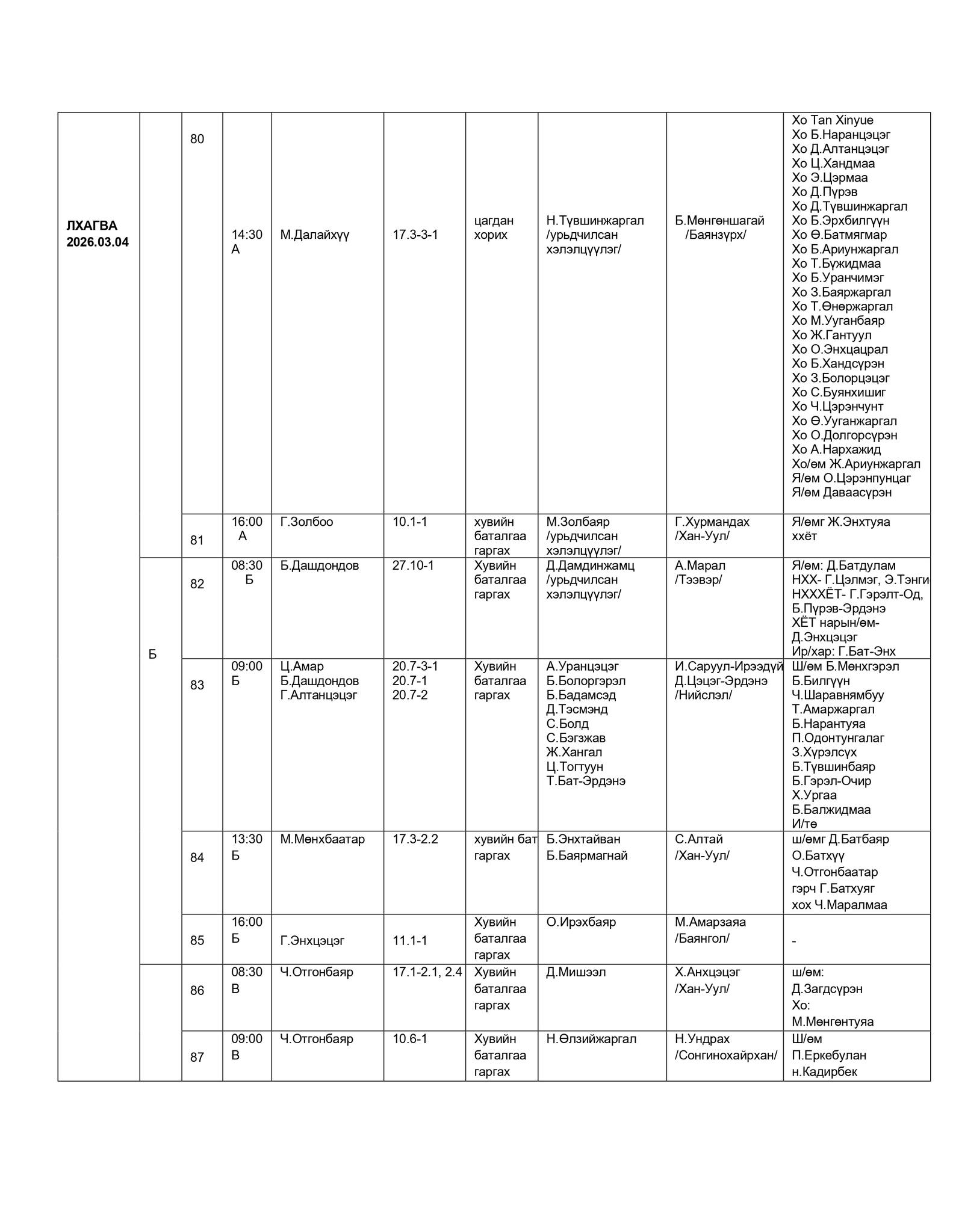- БАЯНГОЛ, ХАН-УУЛ, СОНГИНОХАЙРХАН ДҮҮРГИЙН ЭРҮҮГИЙН ХЭРГИЙН АНХАН ШАТНЫ ТОЙРГИЙН ШҮҮХИЙН ШҮҮХ ХУРАЛДААНЫ ЗАР /2026.03.02-03.06/