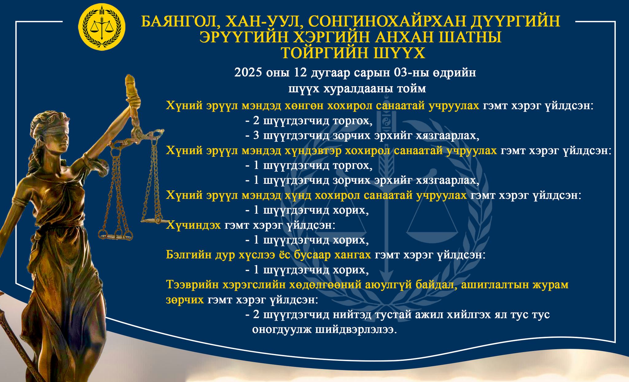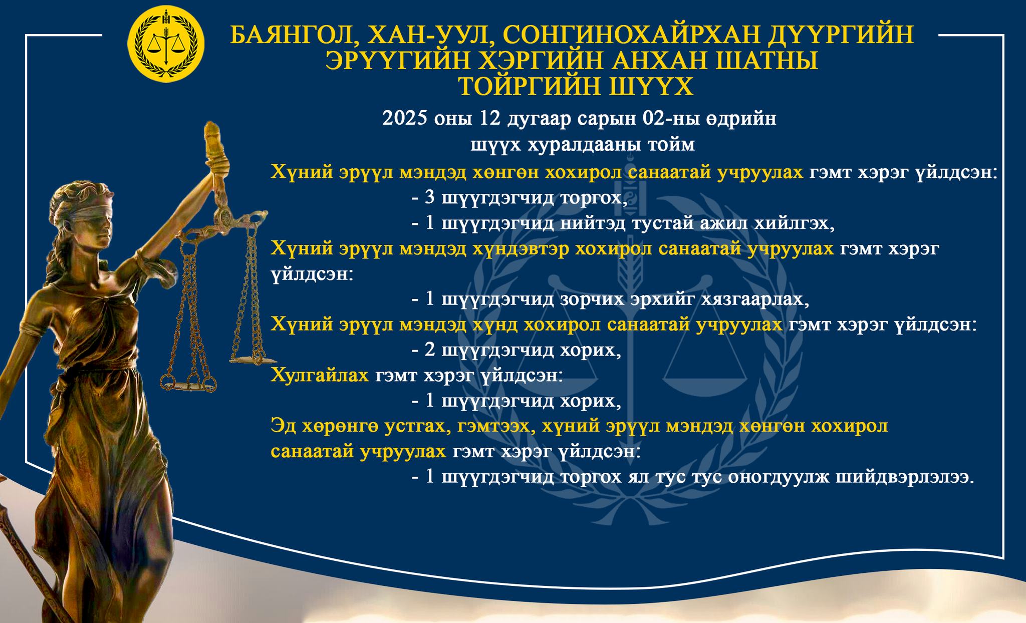 - БАЯНГОЛ, ХАН-УУЛ, СОНГИНОХАЙРХАН ДҮҮРГИЙН ЭРҮҮГИЙН ХЭРГИЙН АНХАН ШАТНЫ ТОЙРГИЙН ШҮҮХ ТОЙМ /2025.12.01-2025.12.05/