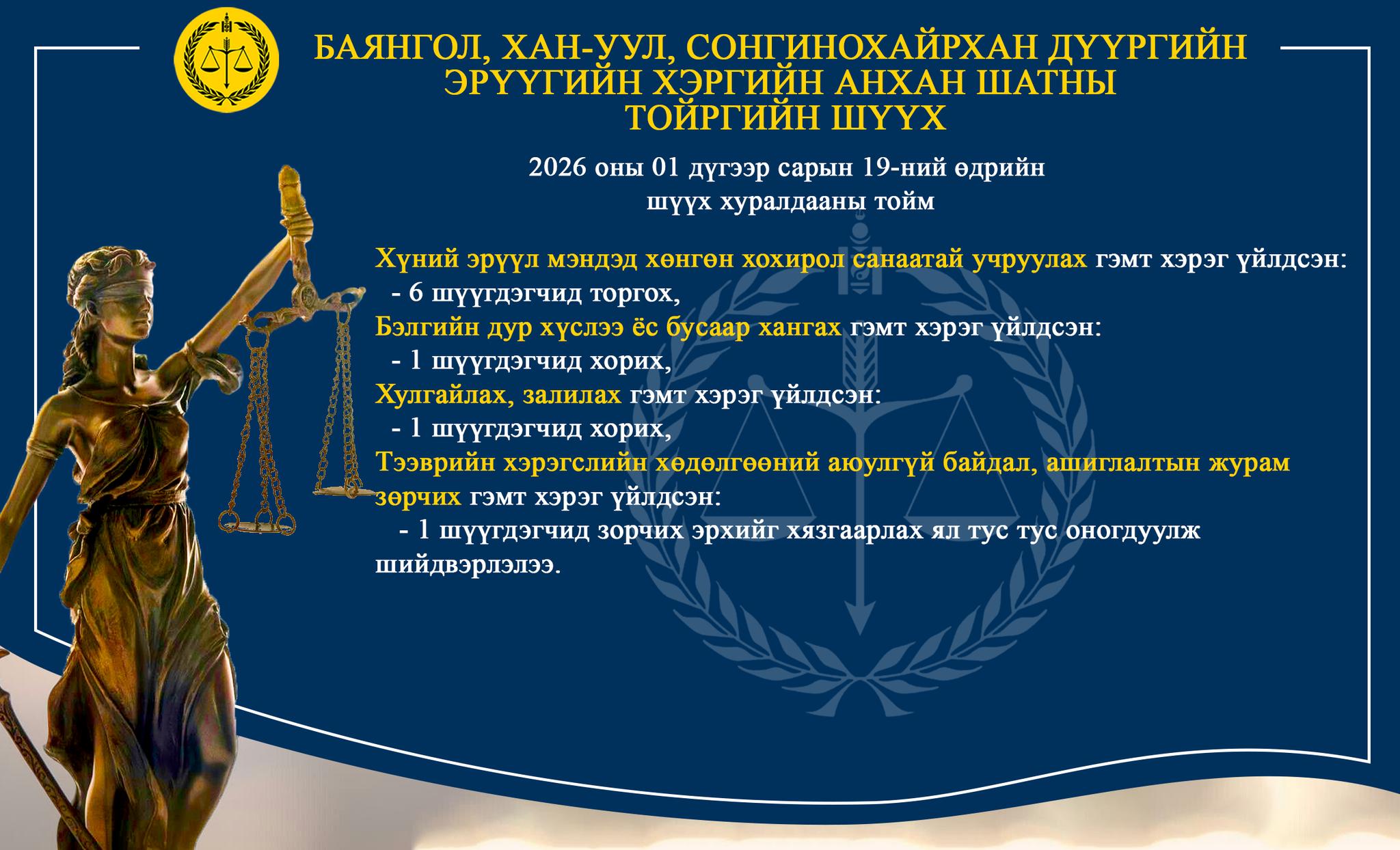 БАЯНГОЛ, ХАН-УУЛ, СОНГИНОХАЙРХАН ДҮҮРГИЙН ЭРҮҮГИЙН ХЭРГИЙН АНХАН ШАТНЫ ТОЙРГИЙН ШҮҮХ ТОЙМ /2026.01.19-2026.01.20/