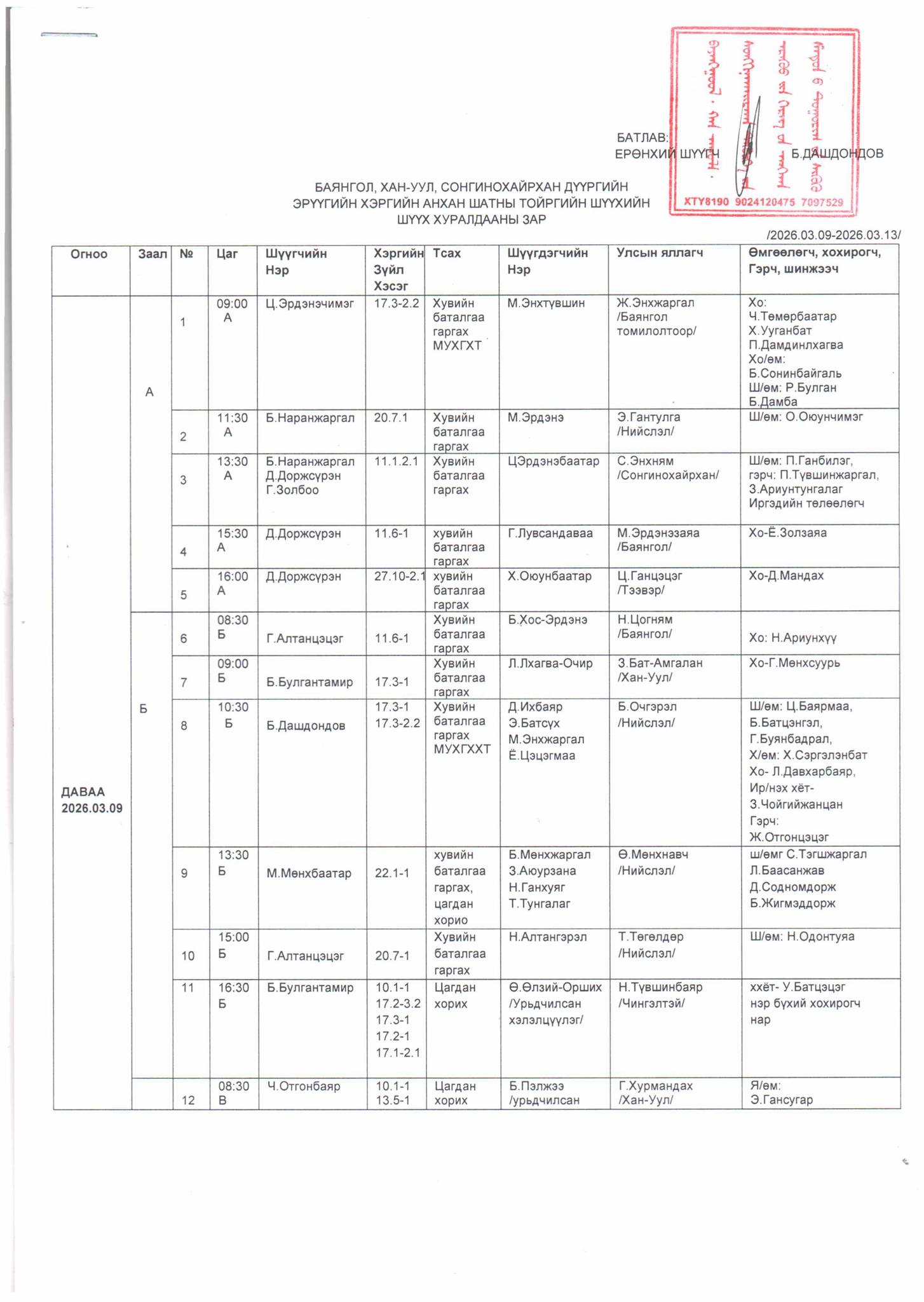 БАЯНГОЛ, ХАН-УУЛ, СОНГИНОХАЙРХАН ДҮҮРГИЙН ЭРҮҮГИЙН ХЭРГИЙН АНХАН ШАТНЫ ТОЙРГИЙН ШҮҮХИЙН ШҮҮХ ХУРАЛДААНЫ ЗАР /2026.03.09-03.13/