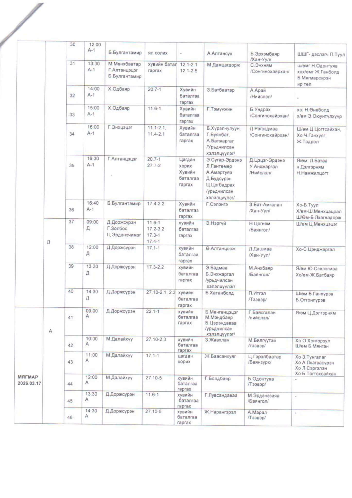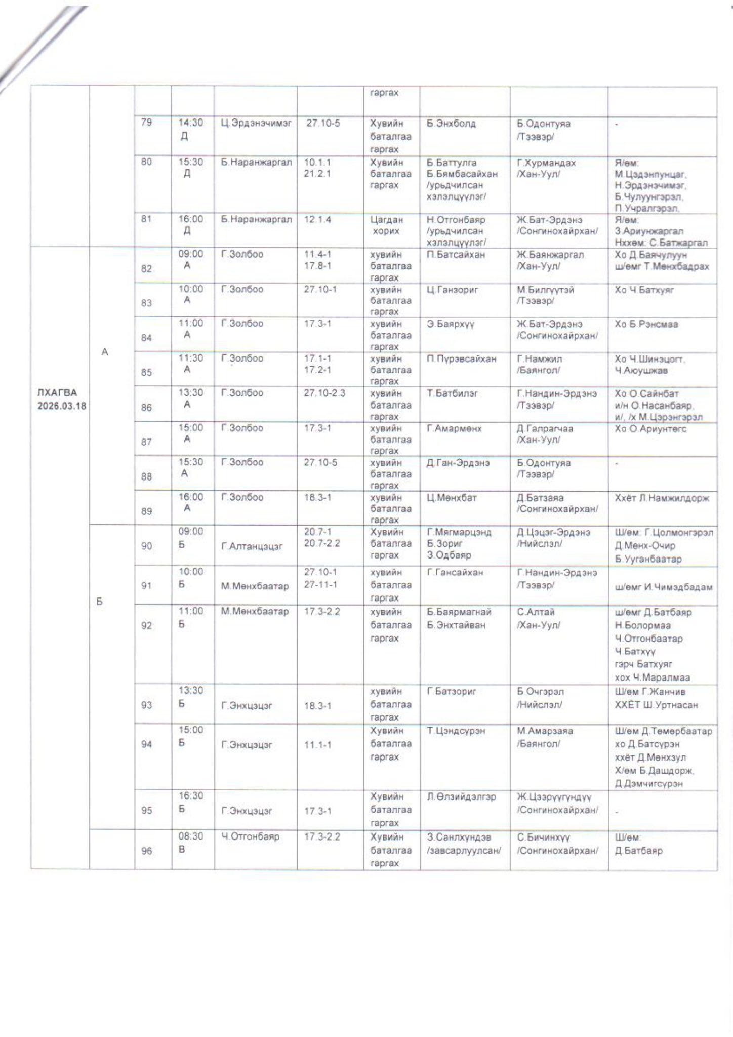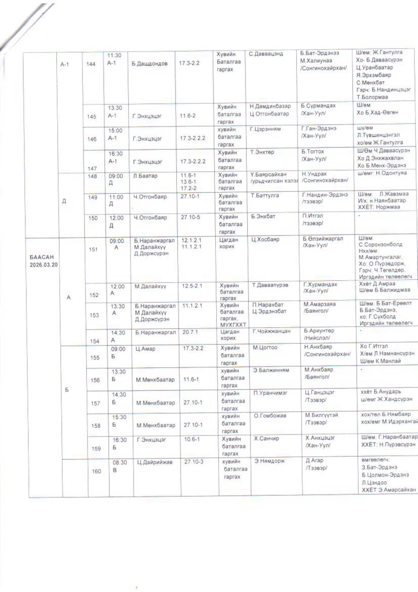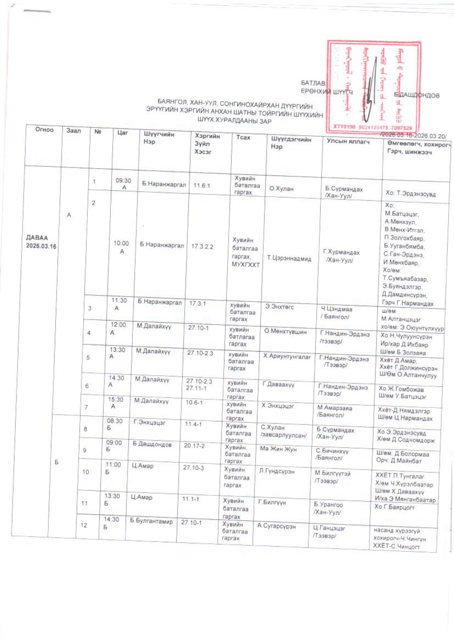- БАЯНГОЛ, ХАН-УУЛ, СОНГИНОХАЙРХАН ДҮҮРГИЙН ЭРҮҮГИЙН ХЭРГИЙН АНХАН ШАТНЫ ТОЙРГИЙН ШҮҮХИЙН ШҮҮХ ХУРАЛДААНЫ ЗАР /2026.03.16-03.20/