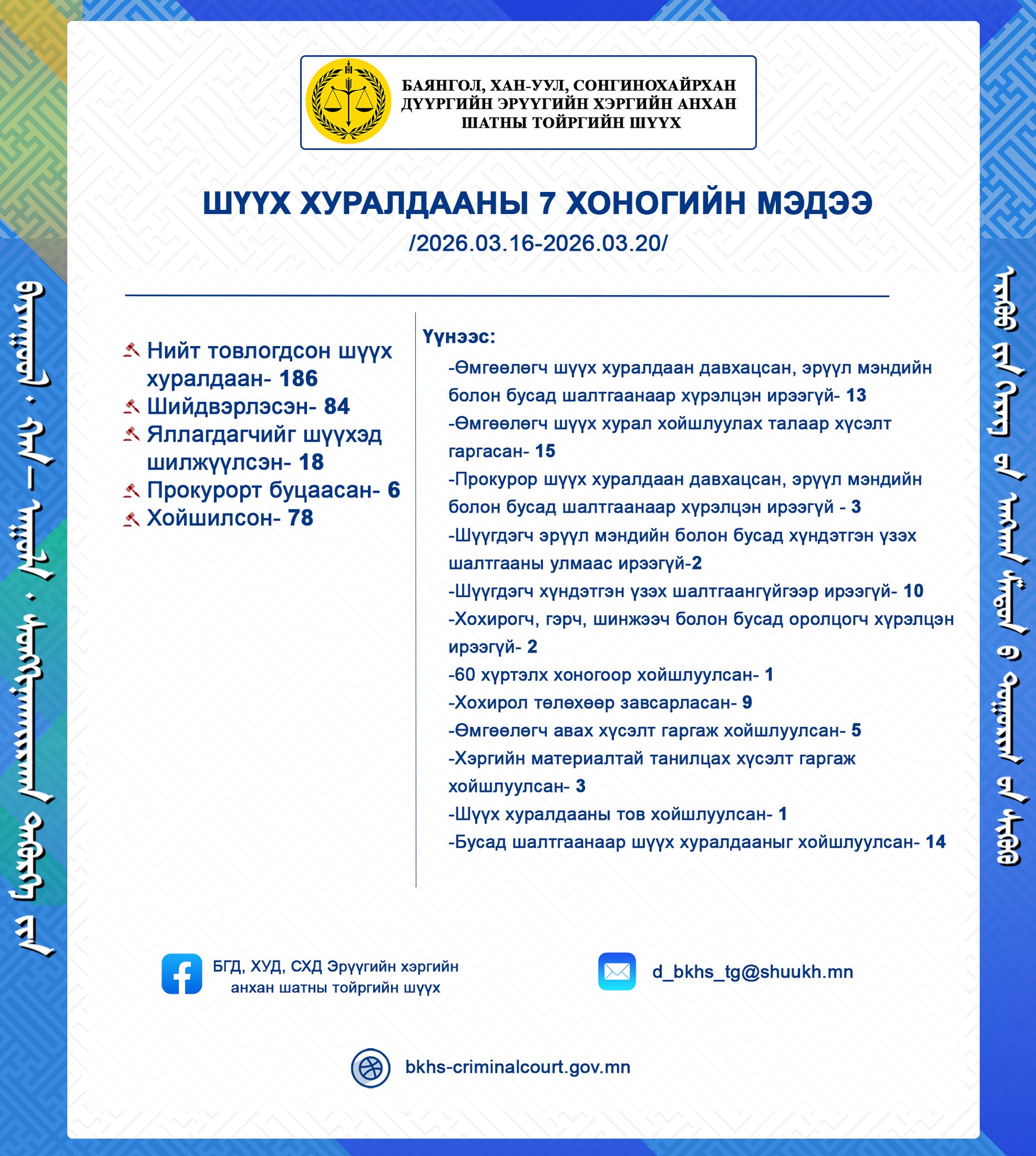 ШҮҮХ ХУРАЛДААНЫ 7 ХОНОГИЙН ТОЙМ /2026.03.16-2026.03.20/