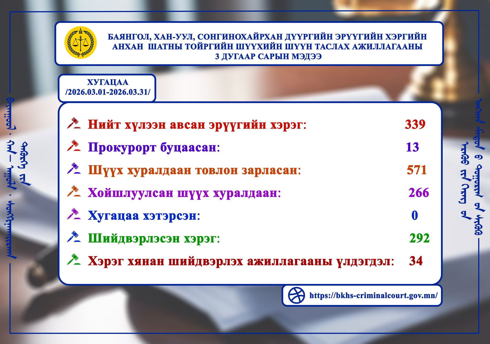 ШҮҮН ТАСЛАХ АЖИЛЛАГААНЫ МЭДЭЭ 2026 оны 3 дугаар сарын шүүн таслах ажиллагааны мэдээг танилцуулж байна.