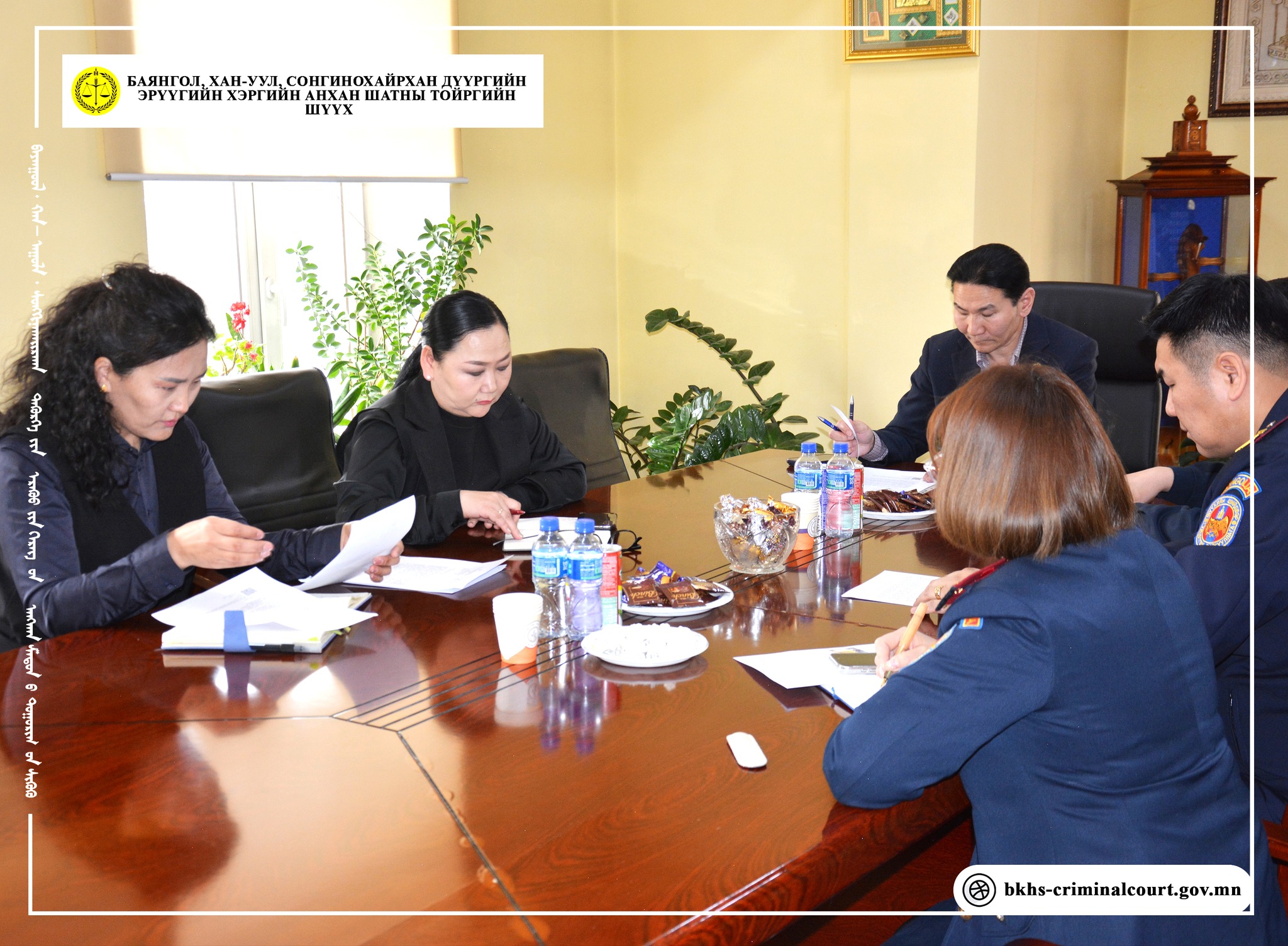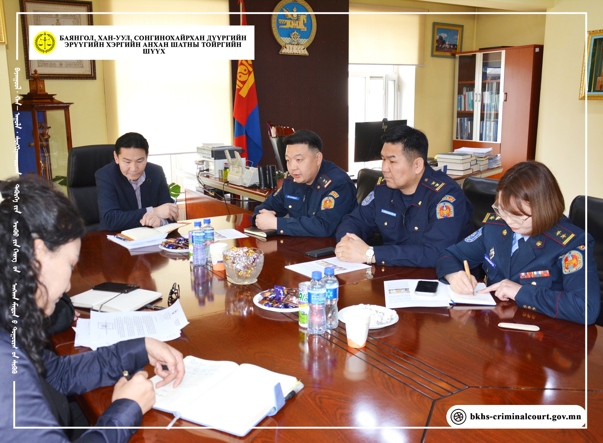 Баянгол, Хан-Уул, Сонгинохайрхан дүүргийн Эрүүгийн хэргийн анхан шатны тойргийн шүүхийн Ерөнхий шүүгч Б.Дашдондов болон тус шүүхийн удирдлагууд Нийслэлийн шүүхийн шийдвэр гүйцэтгэх газрын хорихоос өөр төрлийн ял эдлүүлэх хэлтсийн удирдлагуудтай 2026 оны 4 дүгээр сарын 16-ны өдөр хамтарсан уулзалт зохион байгууллаа.