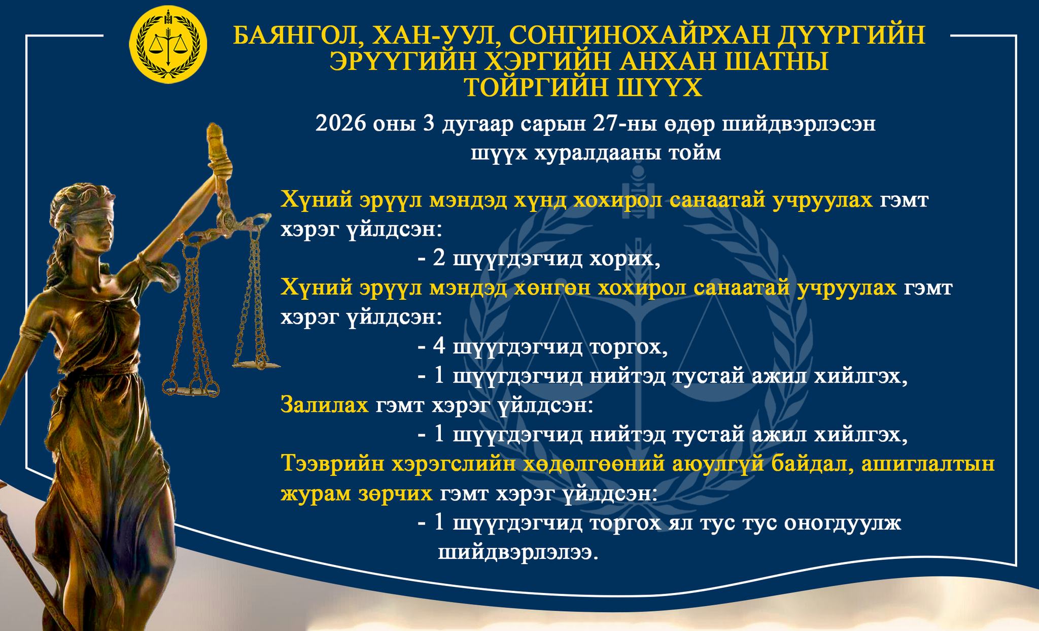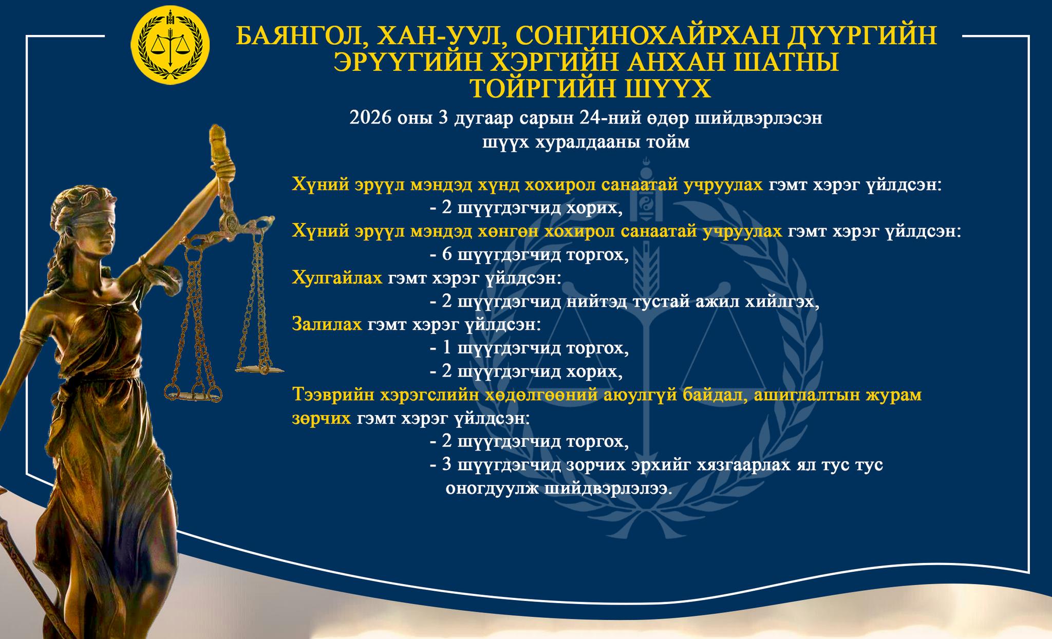 БАЯНГОЛ, ХАН-УУЛ, СОНГИНОХАЙРХАН ДҮҮРГИЙН ЭРҮҮГИЙН ХЭРГИЙН АНХАН ШАТНЫ ТОЙРГИЙН ШҮҮХ ТОЙМ /2026.03.23-2026.03.27/