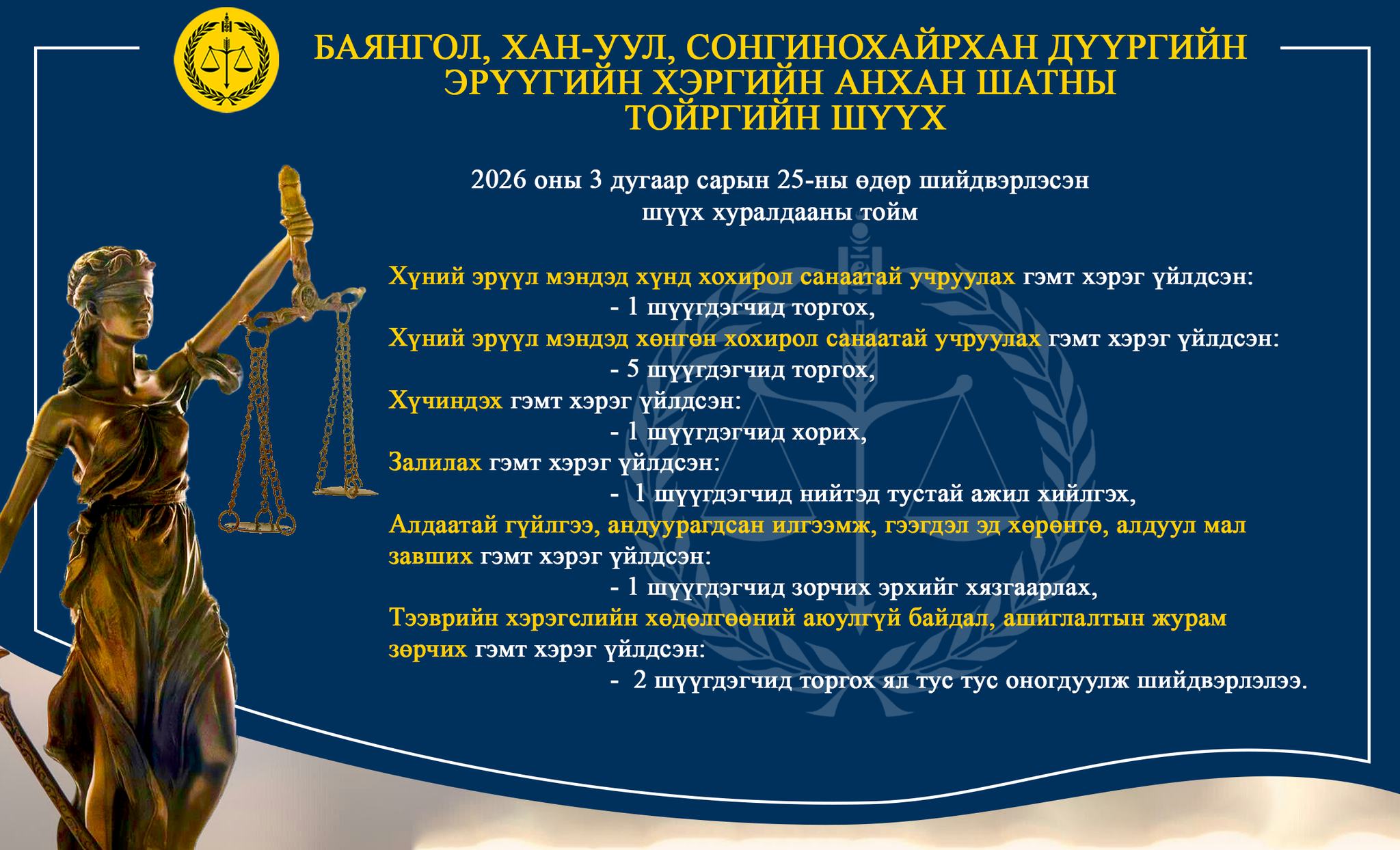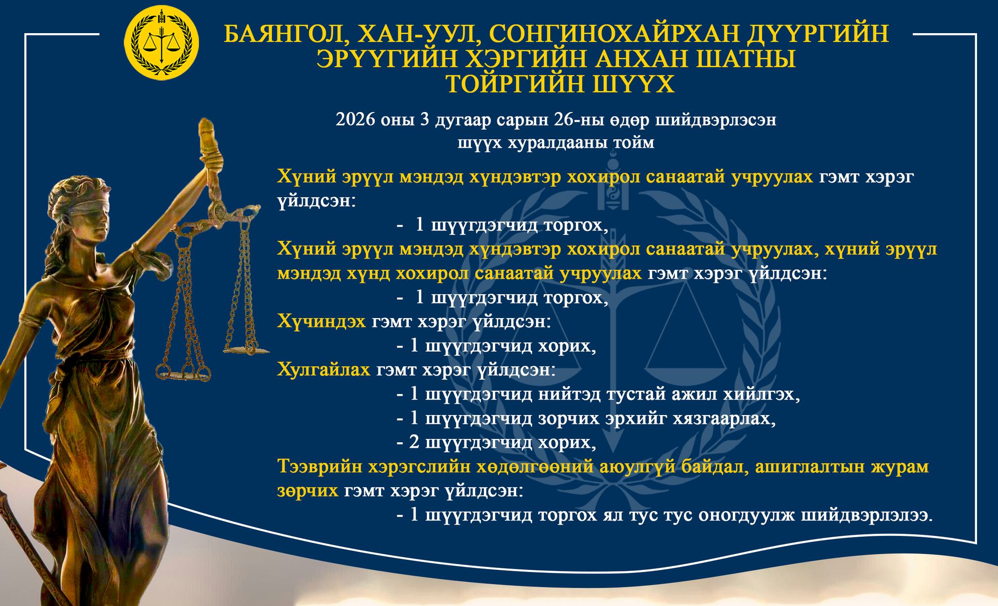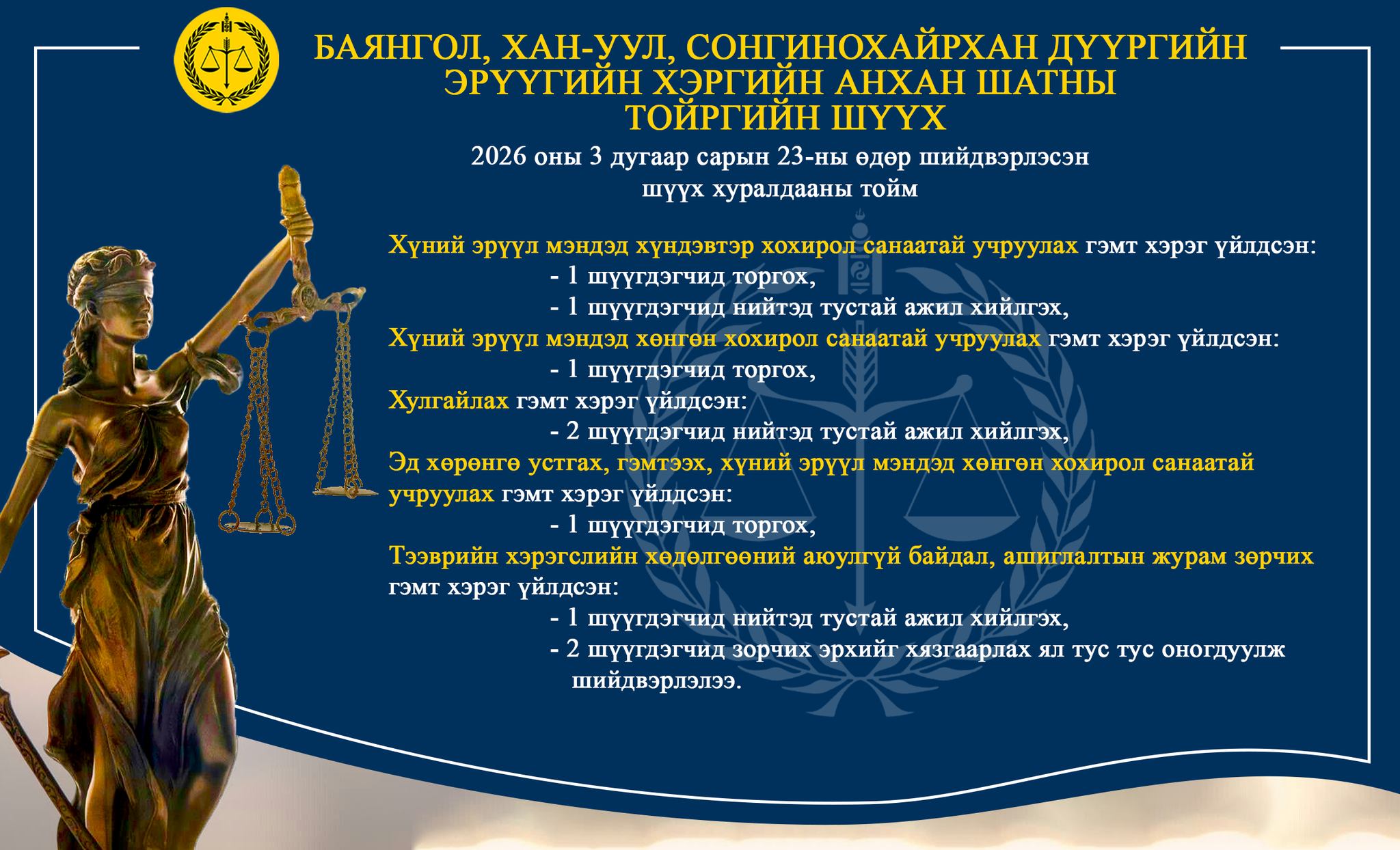 - БАЯНГОЛ, ХАН-УУЛ, СОНГИНОХАЙРХАН ДҮҮРГИЙН ЭРҮҮГИЙН ХЭРГИЙН АНХАН ШАТНЫ ТОЙРГИЙН ШҮҮХ ТОЙМ /2026.03.23-2026.03.27/