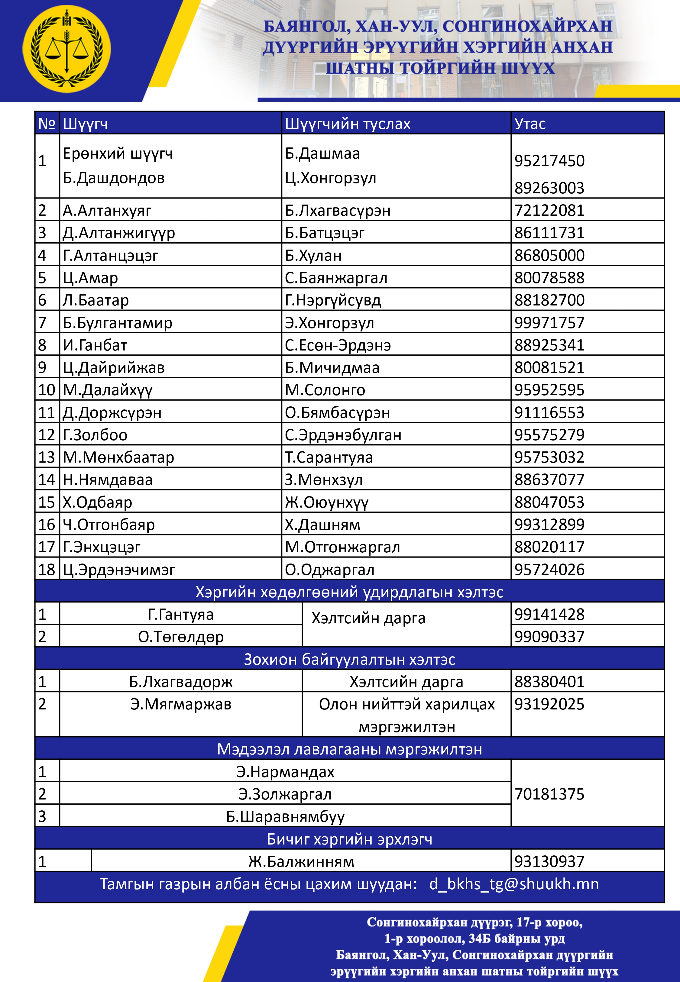 Утас, факс: 70181375 Шүүхийн цагдаа: 89773111 Хаяг: Сонгинохайрхан дүүрэг, 17-р хороо, 1-р хороолол, 34Б байрны урд өөрийн байр Имэйл: